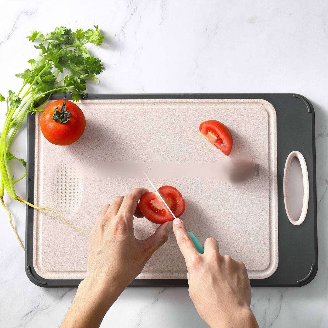 De andere kant is speciaal ontworpen voor het snijden van fruit en brood en biedt een gespecialiseerd oppervlak voor elke keukentaak.