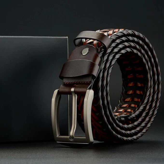 Deze gevlochten riem van koeienhuid combineert tijdloos vakmanschap met een strakke, eigentijdse look.