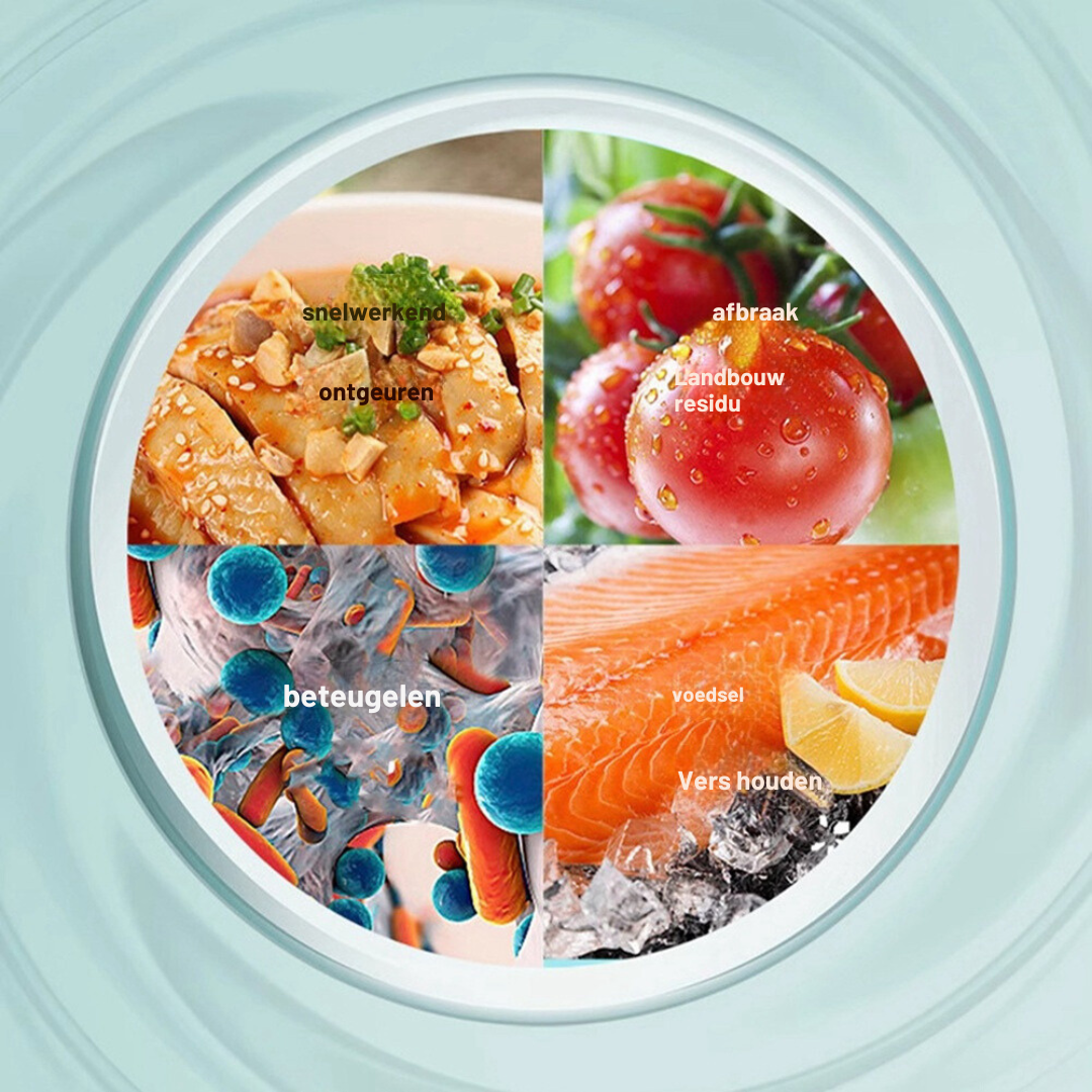 Met behulp van geavanceerde technologie pakt dit apparaat nare geurtjes aan, verlengt het de levensduur van je fruit en groenten en vermindert het de resten van bestrijdingsmiddelen.