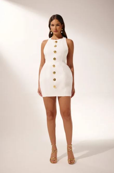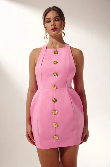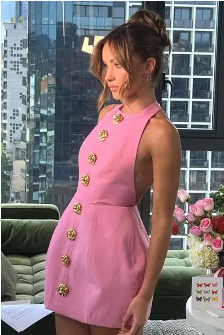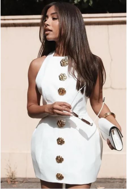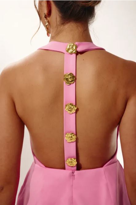 Verfraai je garderobe met onze jurk met T-rug en ingewikkelde handgestikte bloemenhardware en een stijlvolle minilengte.