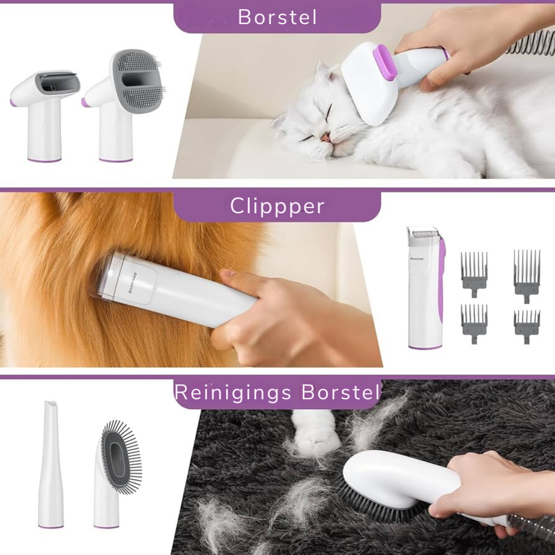 Deze grooming tool biedt vier functies in één: borstelen,stofzuigen,masseren en ontklitten.